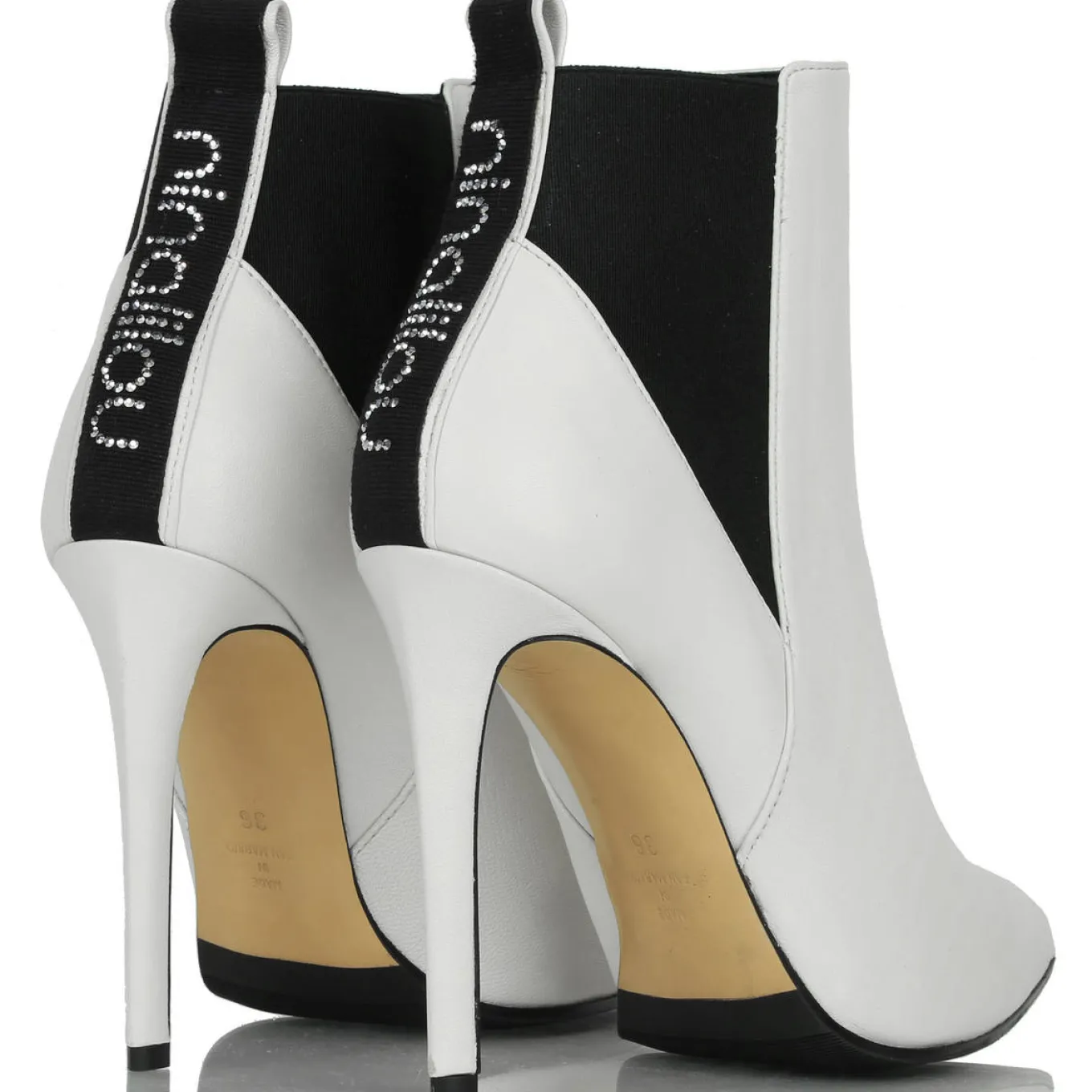 Tronchetto in pelle. Scritta coon Swarovski. Suola in cuoio e gomma, tacco 110. DISPONIBILE IN 7 GIORNI
